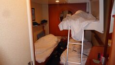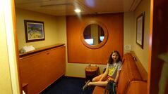 Die Fähre war riesig und eine richtige kleine Stadt. Am Nachmittag haben wir eine Stunde im Aquapark mit Rutschbahn und Flussbad auf Deck 14 verbracht, Die Kabine war extrem kompakt und praktisch eingerichtet.